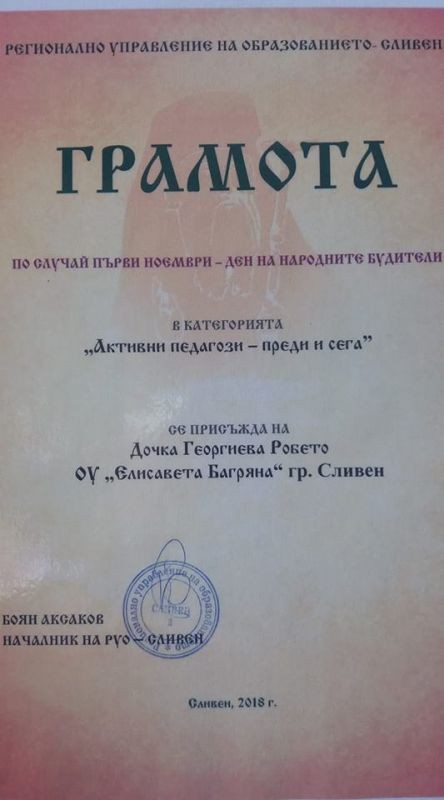 Г-жа Дочка Робето е носителят на наградата "Софроний Врачански" за 2018 година в категория "Активни педагози - преди и сега". Тя е дългогодишен учител в ОУ "Елисавета Багряна". През тази година заслужено излезе в пенсия.