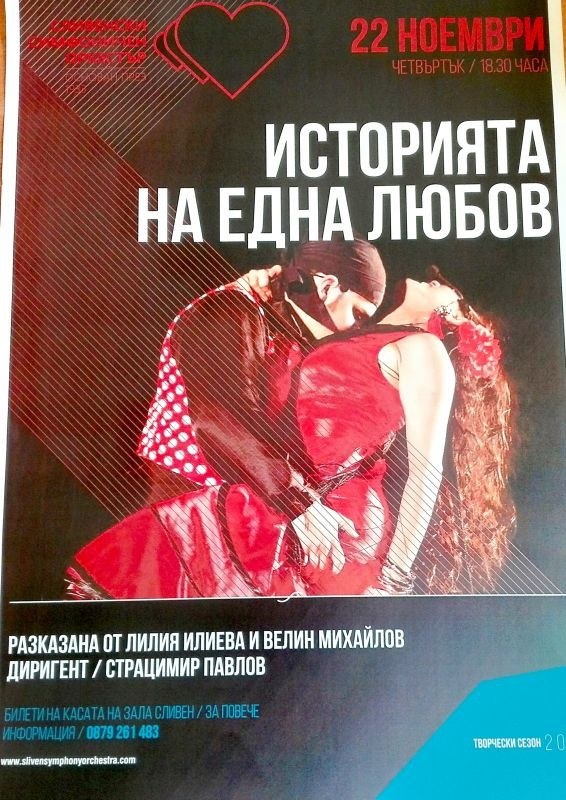„Историята на една любов“ ще представи Сливенският симфоничен оркестър, под диригентството на Страцимир Павлов. На сцената в зала „Сливен“ за нея ще разкажат Лилия Илиева и тенорът Велин Михайлов. Музикалното събитие ще се проведе на 22 ноември от 18.30 часа.