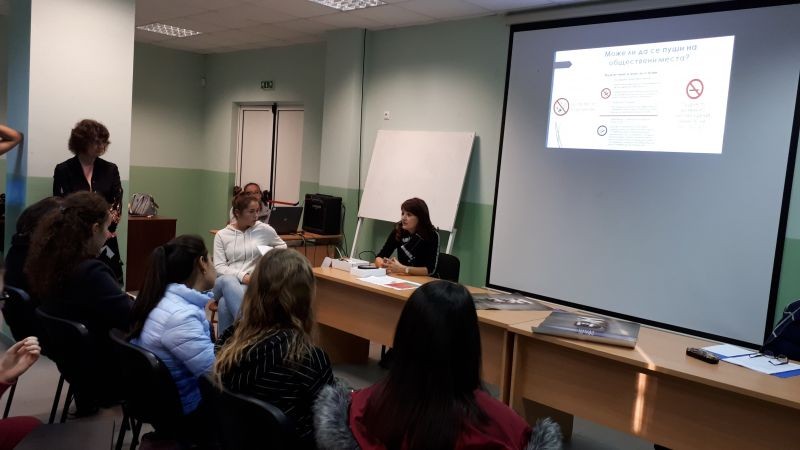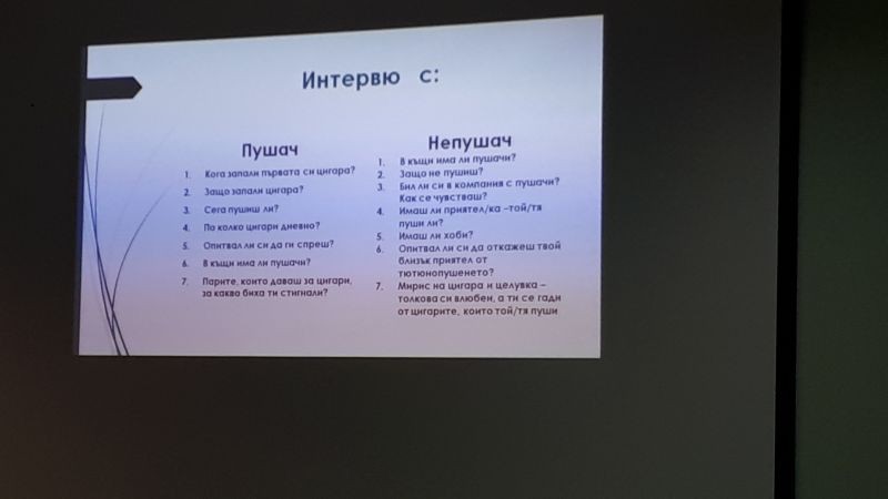 И днес част от училищната общност в Профилираната хуманитарна гимназия „Дамян Дамянов“, съпричастна към проблема, отбеляза Международния ден без тютюнопушене* и участва в импровизирано телевизионно предаване „Днешното утре“. Специални гости в студиото бяха Таня Петрова и Магдалена Славова – експерти от Регионалната здравна инспекция в Сливен. Темата бе обявена предварително: „За и против тютюнопушенето“. Двама ученици влязоха в ролите на политик-виден общественик и на собственик на заведение. Така се роди интересна дискусия дали да се пушат цигари или да се отчете вредата от болестите, които пушенето предизвиква, за да се избере здравето пред мимолетното удоволствие. Страните и публиката спориха и около митовете за тютюнопушенето и за местата, където това може да се прави. В минутките „Споделено” се чуха и видяха кратки интервюта с един пушач и един непушач. Дискусията завърши без победители, вероятно заради избраното студио**, но... предстоят нови „телевизионни“ дебати.