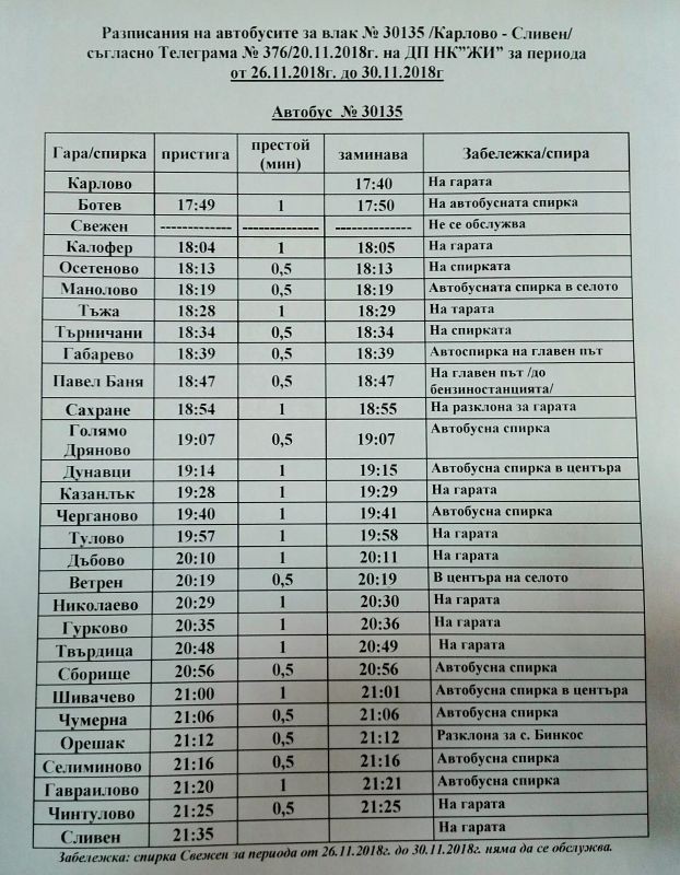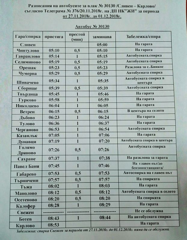 От БДЖ „Пътнически превози“ уведомяват, че поради технически причини се правят следните промени в графика за движение на влаковете. В периода от 26 до 30 ноември 2018г. се отменят влакове № 30240 Стара Загора – Карлово, № 30241 Карлово – Стара Загора, № 30135 Карлово – Сливен.