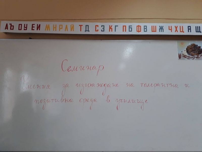 Семинар на тема "Умения за изграждане на толерантна и позитивна среда в училище" се състоя на 27 ноември в ОУ "Елисавета Багряна" в Сливен. В него участваха класните ръководители на първи и втори клас. Семинарът се проведе под формата на игри за сплотяване на колектива. Участниците редиха пъзели, рисуваха по памет, съчиняваха истории по избрани предмети и др.