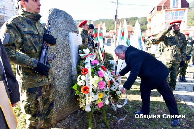 Венци и цветя пред морената на площада поднесоха кметът Стефан Радев, сливенският митрополит Иоаникий, председателят на Общински съвет Сливен Димитър Митев и общински съветници, зам. областният управител Камен Костов, началникът на Гарнизон Сливен и командир на Военно формирование 22220 полк. Любомир Вачев, началникът на РУ на МВР – Сливен гл. инсп. Димитър Кикьов, началникът на Гарнизон Сливен и командир на Военно формирование 22220 полк. Любомир Вачев, директори и представители на институции, неправителствени организации, политически партии, граждани и ученици. На церемонията присъстваха още заместник кметовете Стоян Марков и Пепа Чиликова. Венци и цветя бяха поднесени от името на народния представител Десислава Танева, директора на ТД „Национална сигурност“ Николай Чиликов и директора на ОДМВР – Сливен ст. комисар Димитър Величков.