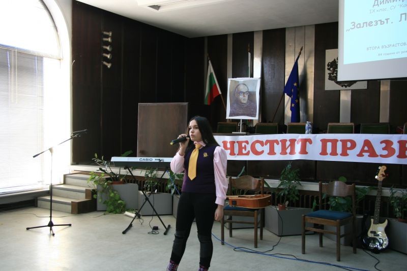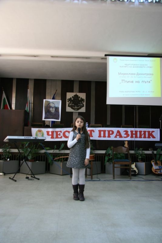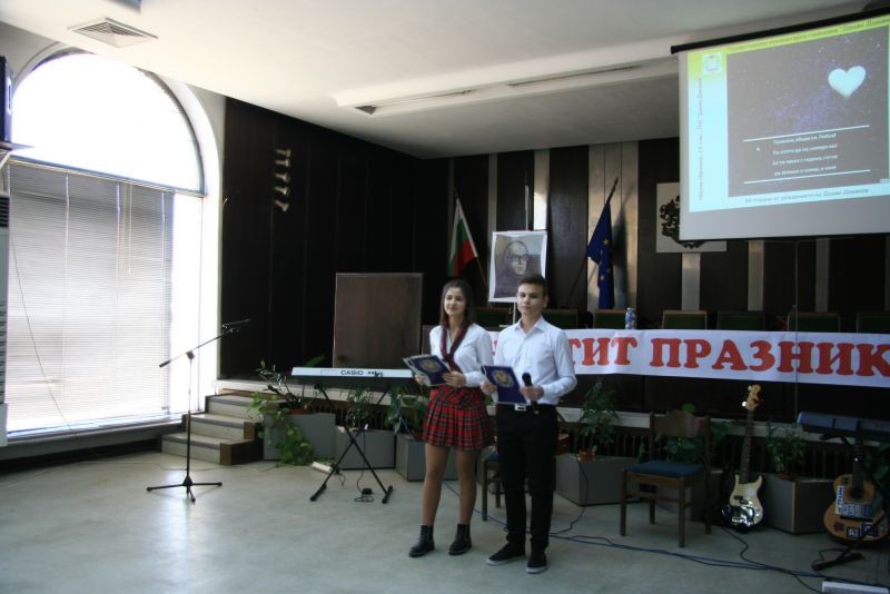 С вълнуващо слово към участниците в тържеството се обърна г-жа Димитриинка Петкова, заместник-областен управител. Тя пожела на учениците и учителите от гимназията да отстояват с дързост и вдъхновение името на своя патрон и с високи резултати в образователно-възпитателния процес да доказват значимата роля на хуманитарното образование за изграждане на активни строители на нова България.