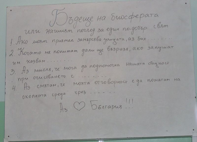 Това бе учебен час по биология и здравно образование, урокът – обобщителен за раздел Макросистема - Биосфера. Използван беше проектно базираният метод на обучение. На учениците бяха раздадени различни теми с възможност за избор при разработването – презентация или кратки доклади. Всеки сам избра дали да работи самостоятелно или в екип, както и формата на представянето на своя проект. Представителната ни изява за нашата съвместна работа беше облечена в нетрадиционен урок под формата на телевизионно предаване – с водещи, участници – гости на предаването, въпроси към публиката, реклами, музикална шапка на предаването. В провеждането на урока участва и Jenny - нашата учителка-доброволка от Китай.