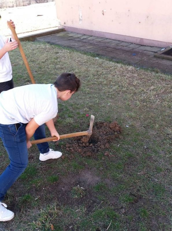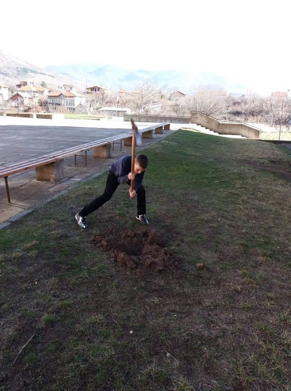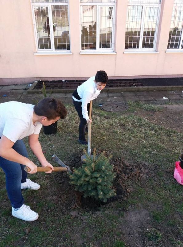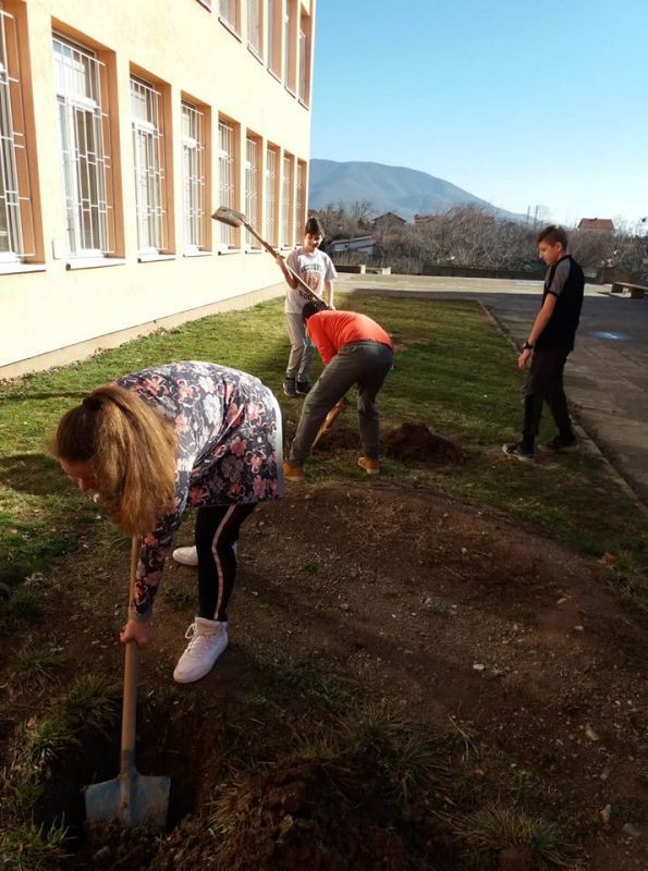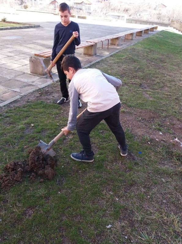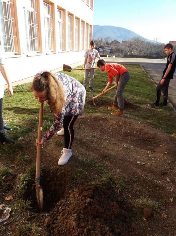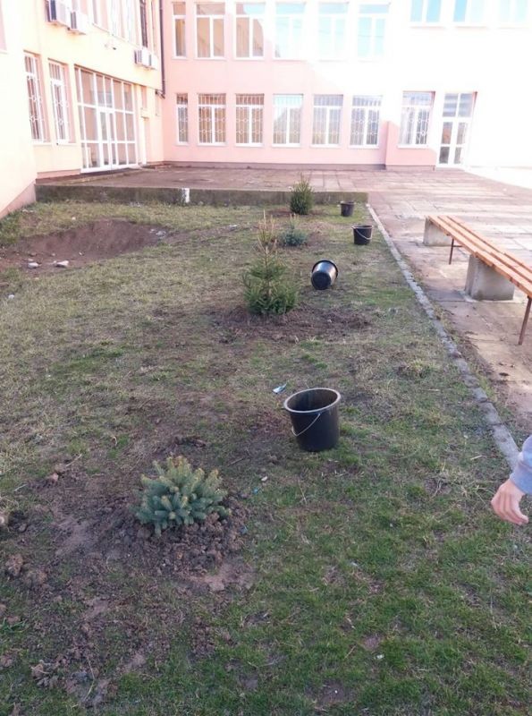По-зелен стана училищният двор в ОУ "Елисавета Багряна" в Сливен. Ученици от 7. клас засадиха 12 елхи и направиха пространството около тях по-красиво.