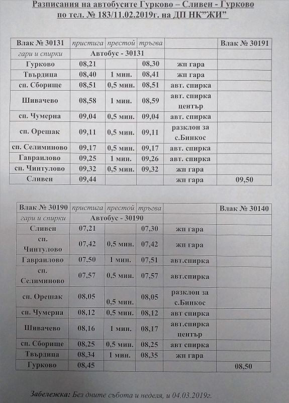 Назначават се влакове №№ 3681 Сливен – Бургас, 3682 Бургас - Сливен, 30190 Бургас – Сливен и 30191 Сливен – Зимница.