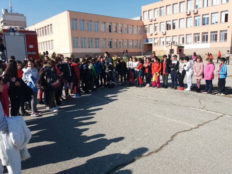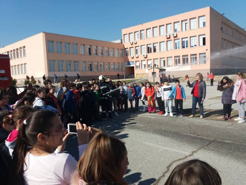 Ученици от пети клас се запознаха с работата на пожарникарите и получиха съвети какво трябва да правят при възникване на пожар. Това стана по време на демонстрация, направена в двора на ОУ "Елисавета Багряна" от Втора дежурна смяна при Районна служба "Пожарна безопасност и защита на населението".