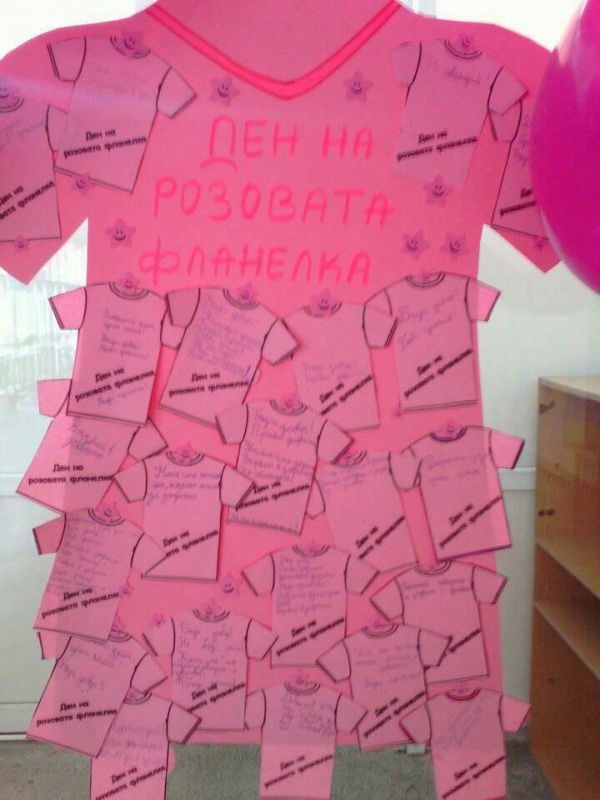За Деня на розовата фланелка бяха изработени интересни постери и табла, гирлянда с послания върху розови тениски от хартия и др.