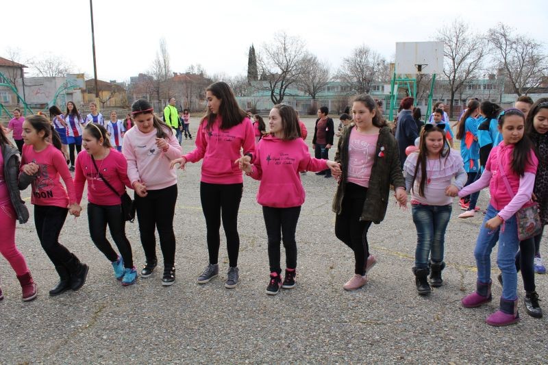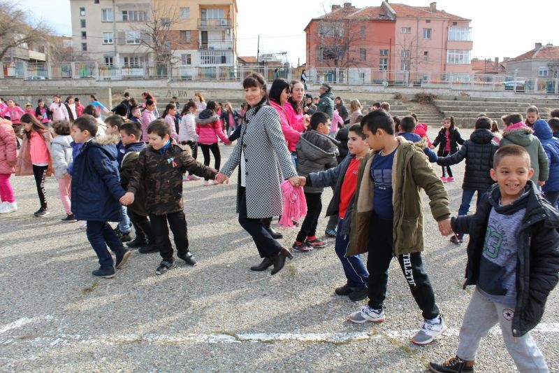 По повод Деня на розовата фланелка, посветен на борбата с тормоза в училище, учениците от ОУ "Панайот Хитов" направиха флашмоб във формата на сърце. Децата пуснаха в небето розови балони с послания за толерантност и разбирателство и се хванаха на пъстро хоро – израз на безкомпромисното им отношение към тормоза в училище и съпричастността им към световната кауза за борба срещу насилието.