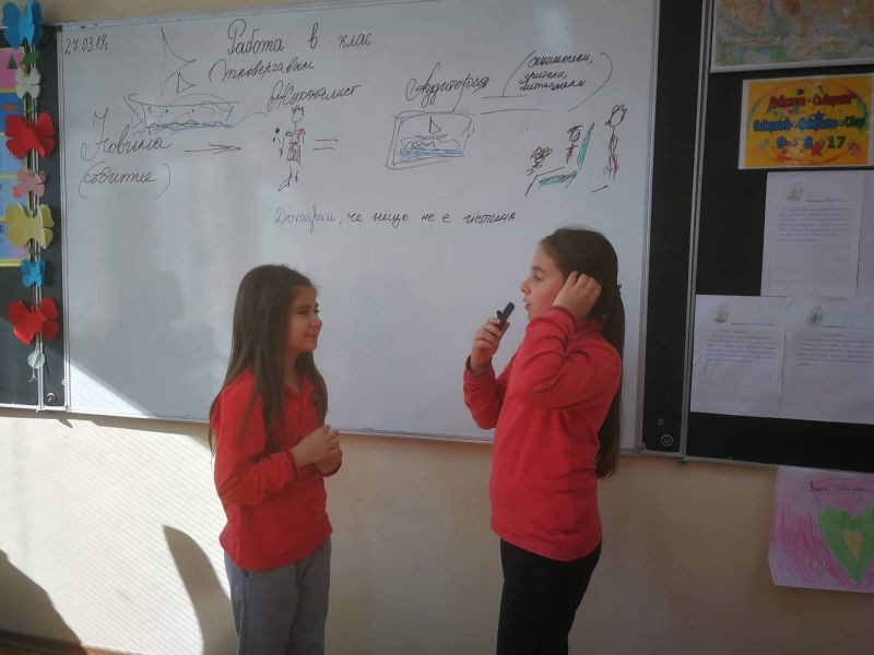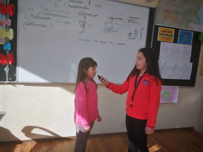 Днес малчуганите се запознаха с Людмила Йоргова – репортер от радио „Фокус” Сливен. След като обсъдиха какво е новина и кога една новина е фалшива, научиха още за професията и сами влязоха в тази роля. Чиновете се изпълниха с „репортажи в картинки” за кражби и пожари. Децата писаха за добри дела и за залавяне на престъпници, правиха интервюта. Сред най-интересните заглавия беше това, че „Момо е измислена играчка и само заплашва децата”. Възможността учениците да се срещат с интересни личности разнообразява учебния процес и развива индивидуалността и творческите възможности.
