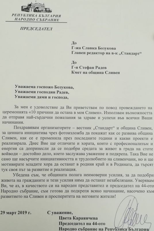 „Убедена съм, че общината полага неимоверни усилия, за да подобри живота на гражданите и тези усилия няма да останат незабелязани. Уверявам Ви, че аз, в качеството си на народен представител и председател на 44-ото Народно събрание, съм готова да подкрепя всяко начинание, насочено към развитието на Сливен и просперитета на неговите жители“, посочва Караянчева.