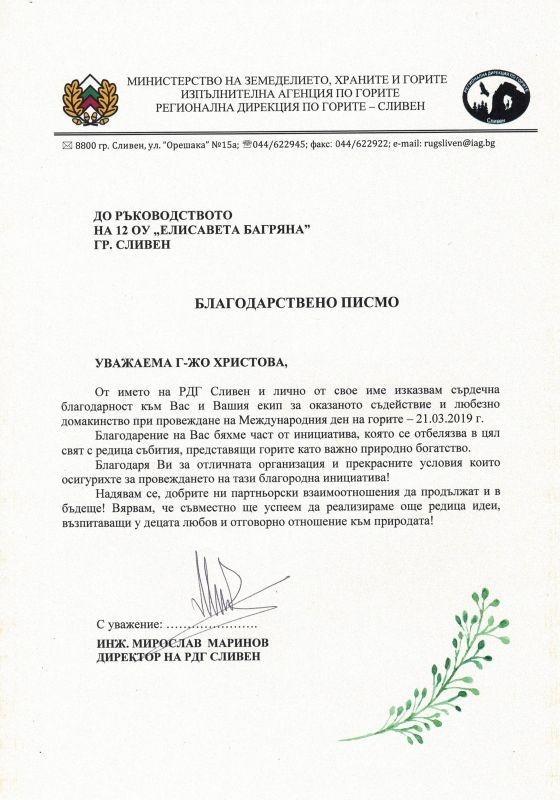 Благодарствено писмо до ОУ "Елисавета Багряна"
