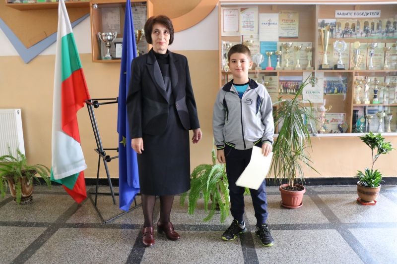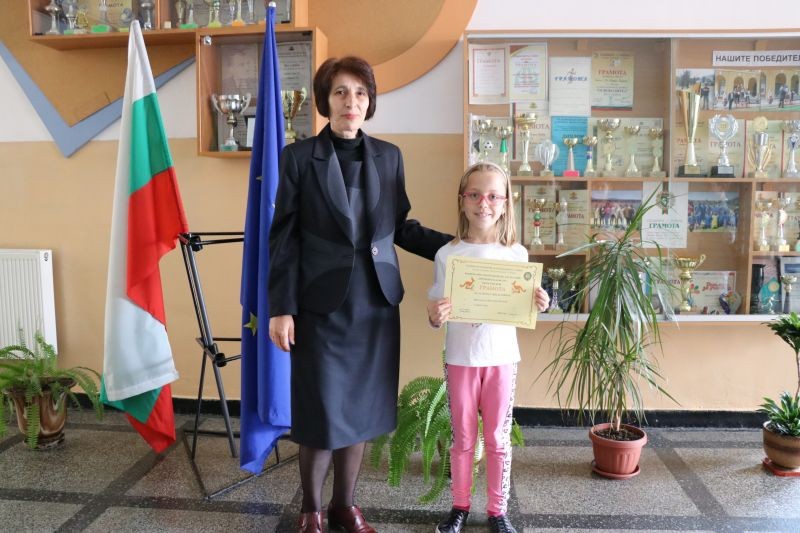 Директорът на СУ "Йордан Йовков" - Сливен, Диана Кънева, връчи грамоти за отлично представяне на учениците, показали най-добри резултати в математическото състезание Европейско кенгуру.