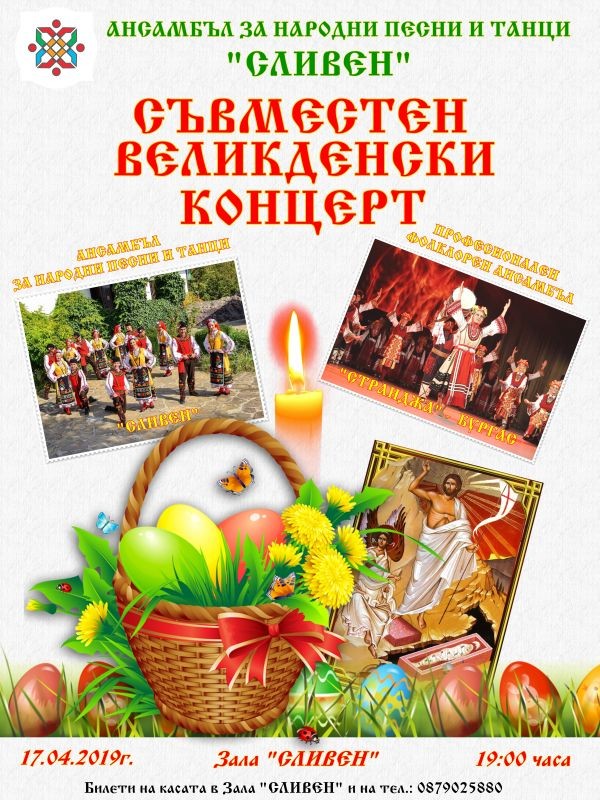 Съвместен великденски концерт на Ансамбъл за народни песни и танци „Сливен“ и Професионален фолклорен ансамбъл „Странджа“ – Бургас ще се състои утре, 17 април. Изявата е част от великденската програмата на Община Сливен. Концертът ще започне от 19 часа в зала „Сливен“.