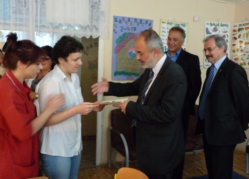 Г-н Тотю Младенов подари книжки и учебни пособия. Децата от своя страна подариха на министъра карта на България, а на дамите собствено ръчно изработени герданчета.