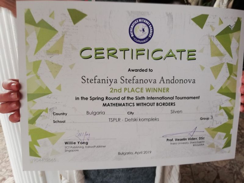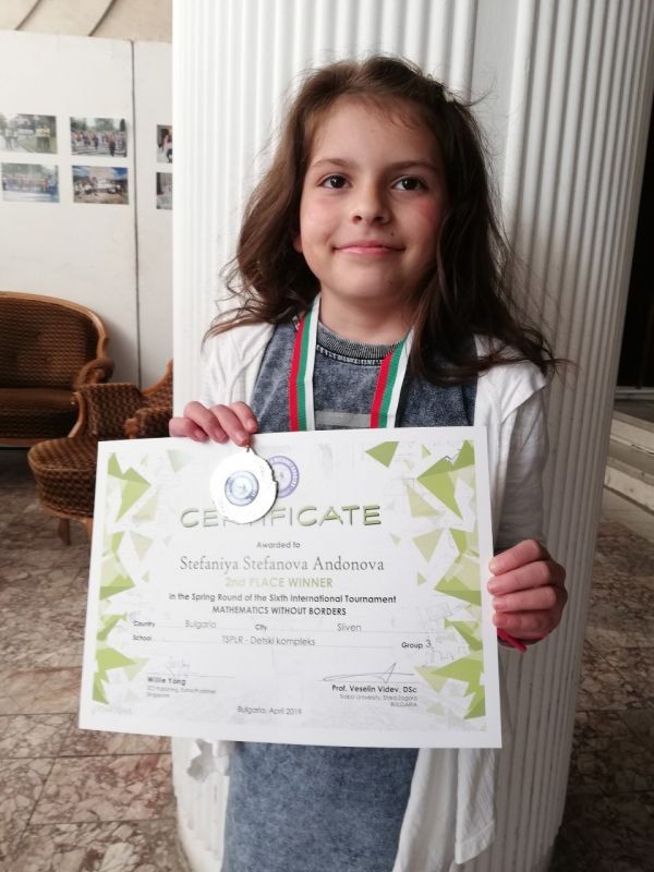 На 23 април 2019 година в Община Сливен- зала Май, се проведе награждаване на медалистите от Международното математическо състезание "Математика без граници"- пролетен кръг 2019 година, организирано с любезното съдействие на ЦПЛР-Детски комплекс Сливен. След златния медал, спечелен на зимния кръг на игрите, Стефания Андонова от III клас на ОУ "Панайот Хитов" отново се окичи с приз - сребърен медал.