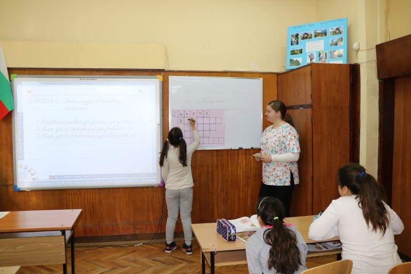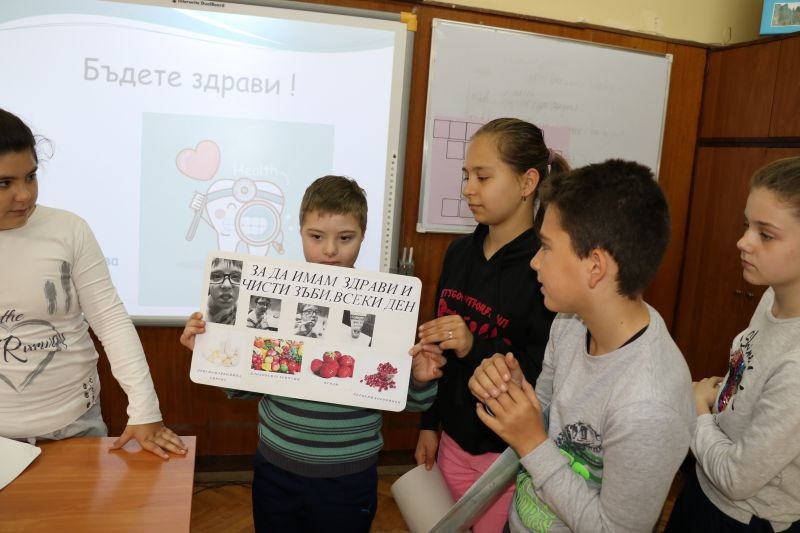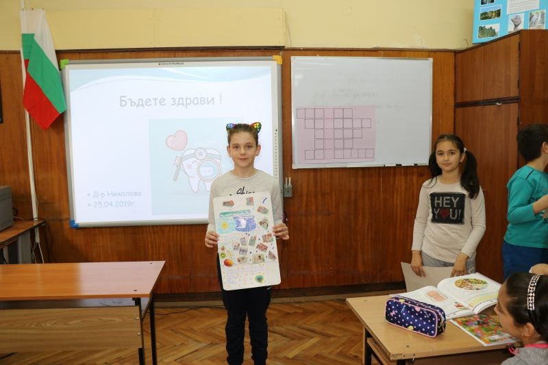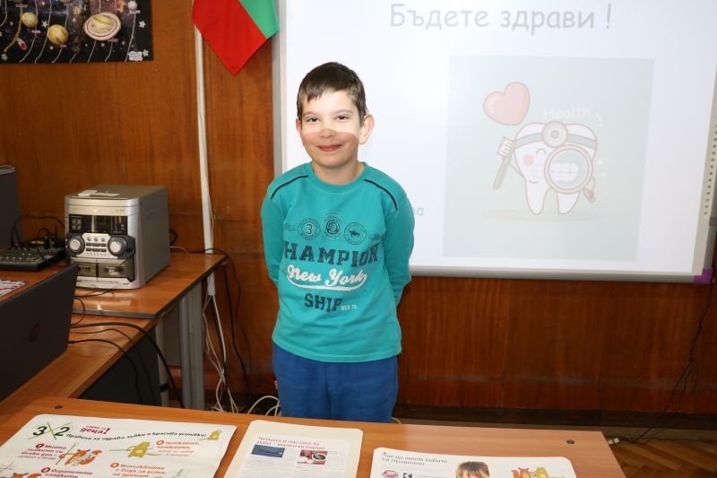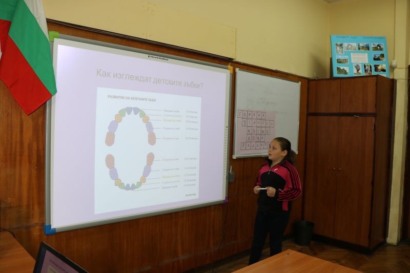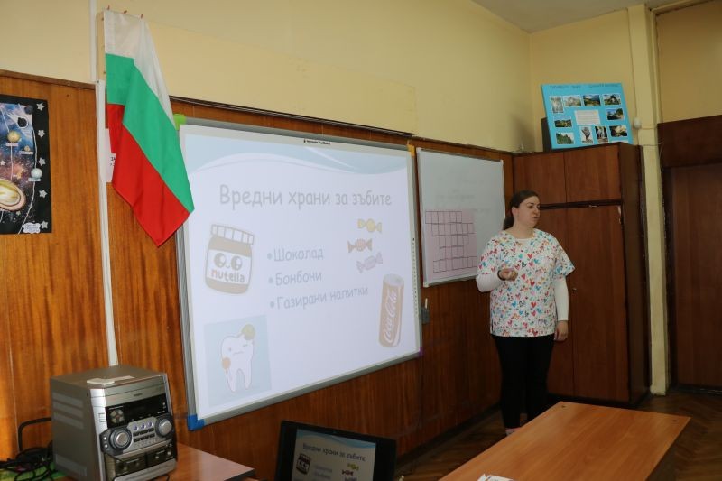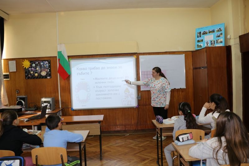 Гостува им нашата лъчезарна и прекрасна зъболекарка д-р Мария Николова. Тя презентира на учениците интересни и любопитни факти, свързани със зъбите и здравословното хранене.