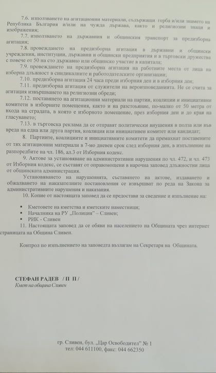 Кметът на Сливен Стефан Радев издаде заповед за предизборните агитационни материали