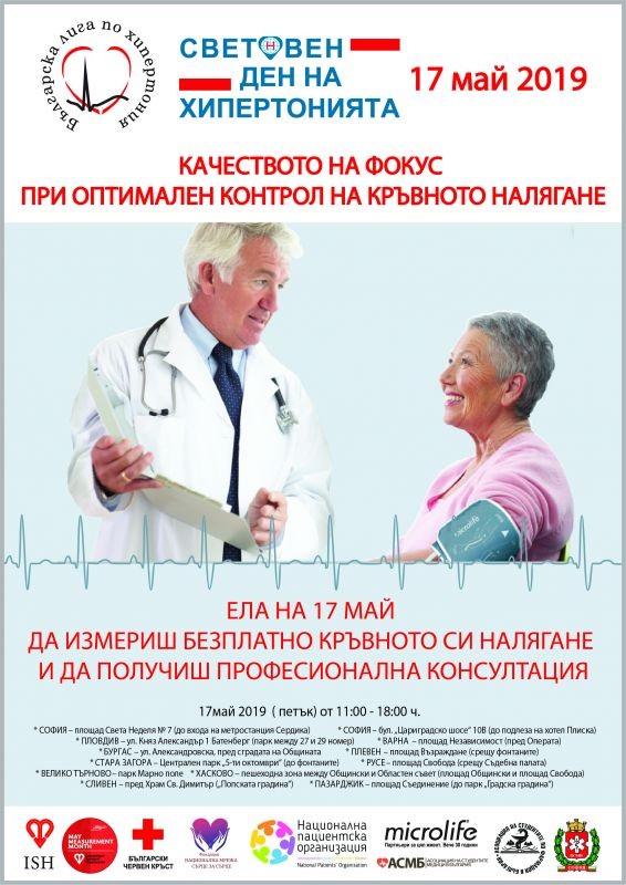На 17 май 2019 година, от 11 до 18 ч., в посочените градове на публични места ще бъдат разположени пунктове, където гражданите ще се информират по проблемите на хипертонията с възможност за квалифицирани консултации за хипертоници. Ще се измерва тегло и кръвно налягане на желаещите с електронни апарати, снабдени с AFIB-технология за откриване на предсърдно мъждене, без ЕКГ. Тази технология е подходящ и сигурен метод за скрининг на асимптомно предсърдно мъждене в домашни условия за профилактика на мозъчен инсулт и за проследяване ефективността на лечение на пациенти с артериална хипертония и/или с риск от предсърдно мъждене.