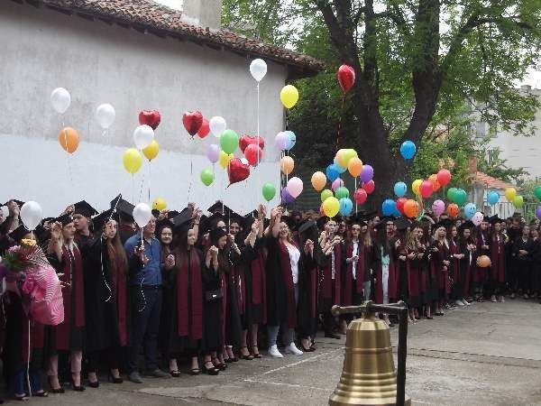 Випускът изрази възторжената си младост с десетки цветни балони. А учителите на 12 клас ги изпратиха с полета на бели гълъби, устремили се към висините.
