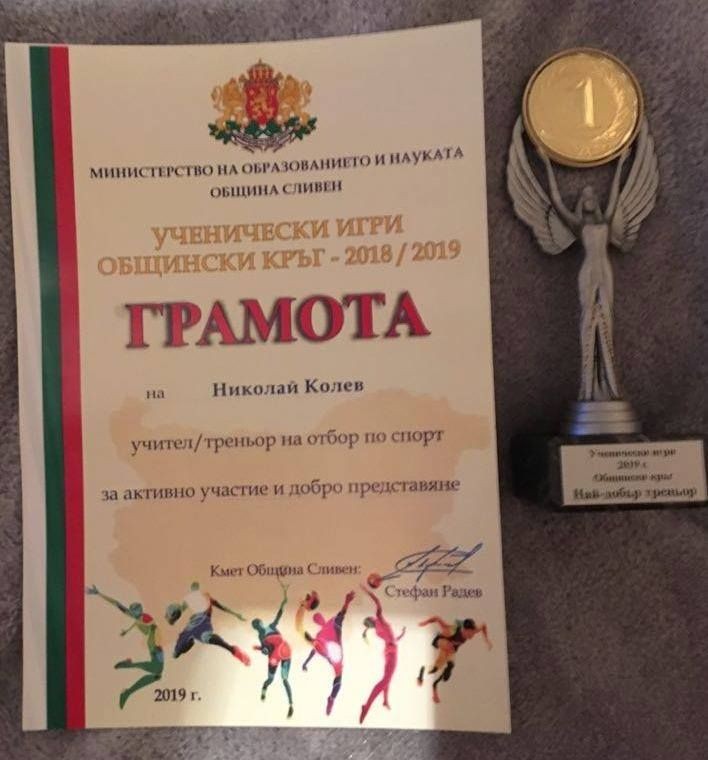 Преподавателят по физическо възпитание и спорт, г-н Николай Колев, получи почетна грамота и плакет за активно участие и добро представяне на учениците му в състезанията.