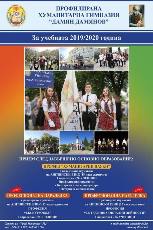 Учебното ни заведение продължава да бъде любимо и предпочитано от младите хора, които обичат литературата, историята и философията. За новата учебна година Профилираната хуманитарна гимназия „Дамян Дамянов” предлага на учениците, завършили основно образование, прием в три паралелки – една с профил ”Хуманитарни науки” , втора по професията "Сътрудник социални дейности", която ще подготвя специалисти за работа с деца и семейства в риск и трета – по професията „Екскурзовод“, която ще отговори на потребностите на туристическия бизнес от истински професионалисти в тази област.