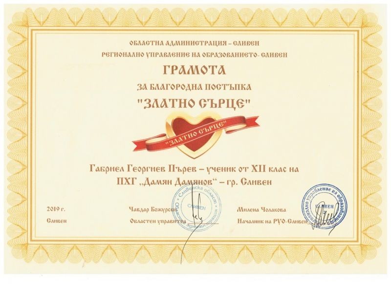 В навечерието на 1 юни зрелостникът от Профилираната хуманитарна гимназия „Дамян Дамянов“ Габриел Пърев бе награден в областната управа със златен медальон във формата на сърце и грамота за приноса му за спасяването на хиляди бездомни животни и за създаването на доброволческа мрежа сред връстниците си. Габриел бе един от най-активните ученици с изявени граждански позиции в гимназията. Участва в различни форми на защита на правата на човека. Познава добре законите и институциите на държавата. С грижи за бездомните животни е ангажиран от две години. Администратор е на страницата „Лапички без дом” (https://www.facebook.com/HomelessPawsBulgaria) с 3300 последователи и на групата „Сливен-зоодоброволци” https://www.facebook.com/groups/293873307438948() с 3600 последователи. Свободното му време е отдадено на бездомните животни – от установяването на проблема (изоставено, ранено или страдащо животно), през осигуряването на транспорт, адекватно лечение в клиника и намиране на осиновители, а също и набиране на средства за заплащане на лечението им. За да се помага във все повече случаи, Габриел създава доброволческа мрежа сред връстниците си, която включва ученици от няколко гимназии в града. Те са обучавани и насърчавани да помагат на най-безпомощните – уличните кучета и котки.