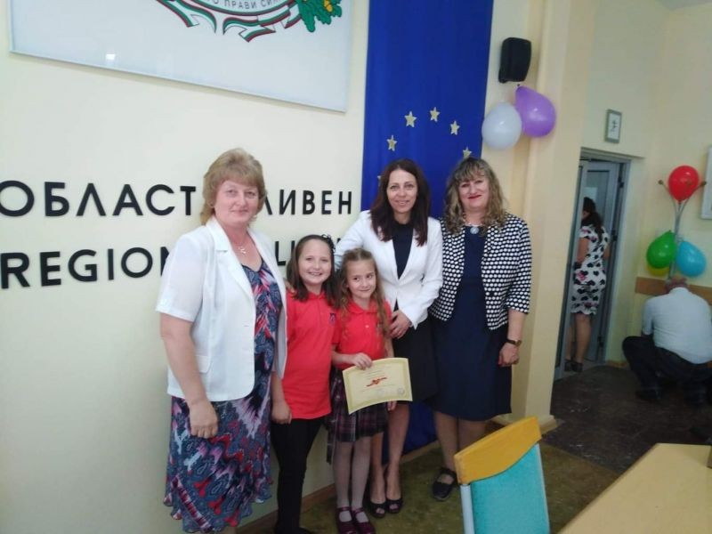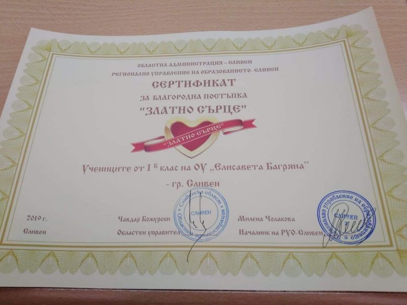 Учениците от 1. "б" клас и техният класен ръководител г-жа Илка Петрова получиха сертификат за благородна постъпка "Златно сърце". Това стана на официална церемония в Областна администрация - Сливен, където бяха връчени традиционните награди "Златно сърце" от областния управител и Регионалното управление на образованието в навечерието на 1 юни, Международния ден на детето.
