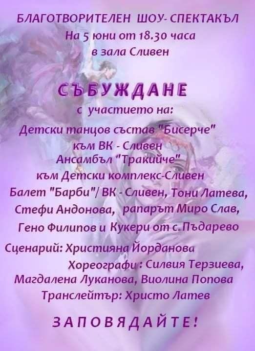 Благотворителен шоу-спектакъл „Събуждане“ ще се състои на 5 юни в зала „Сливен“. Средствата ще бъдат дарени за спасяване на паметника на Шести артилерийски полк.
