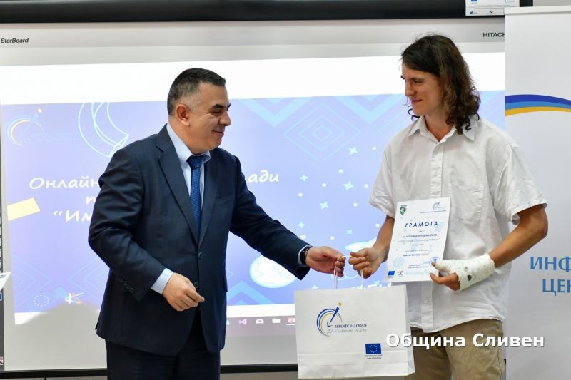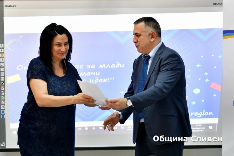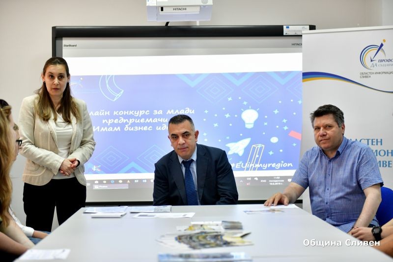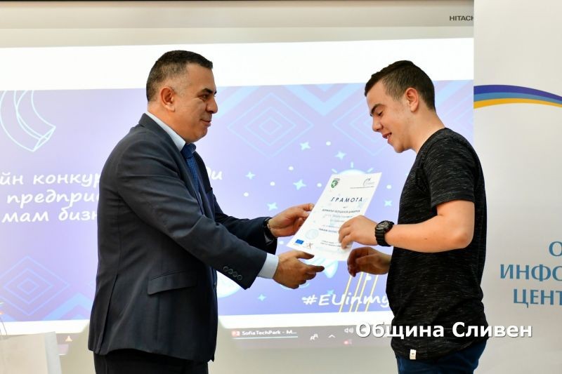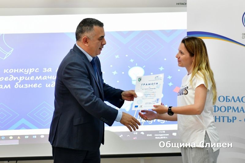 В залата на Областния информационен център по-рано днес бяха наградени победителите и участници в онлайн конкурса за млади предприемачи на тема „Имам бизнес идея!“. Инициативата бе част от кампанията на Европейската комисия „Европа в моя регион“. В надпреварата за област Сливен се включиха дванадесет млади предприемачи от градовете Сливен, Шивачево и Белослав. Конкурсът се реализира онлайн чрез социалната мрежа Facebook.