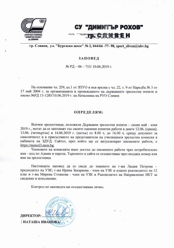 Всеки зрелостник от Спортно училище "Димитър Рохов" може да се запознае със своята оценена работа от Държавните зрелостни изпити в периода 12-14.06.2019г.