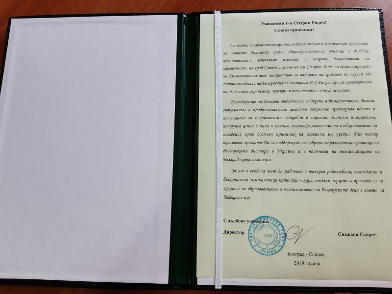 Благодарности за организирания в Сливен благотворителен концерт за 160-та годишнина на Болградската гимназия „Г.С. Раковски“ се отправят към кмета Стефан Радев в поздравителен адрес от директора Снежана Корич. Тя благодари на община Сливен и всички приятели на училището, които са подкрепили благородната инициатива. Концертът се състоя през 2018 година, когато се навършиха 160 години от откриването на гимназията – първото средно българско училище, което се намира в град Болград, Одеска област, Украйна. Организатори на концерта бяха Община Сливен и фондация „Памет“.