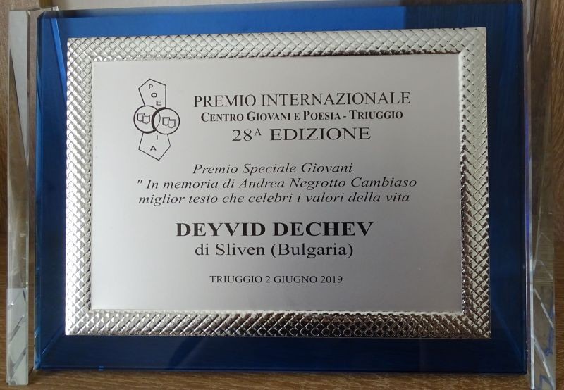 В първия ден на август Дейвид Дечев - десетокласник от Профилираната хуманитарна гимназия „Дамян Дамянов“, получи своята специална награда от международен поетичен конкурс в памет на Андреа Негрото Камбиоса. Конкурсът се организира за 28-ми път от община Триуджо, Италия. През тази година в конкурса са участвали повече от 950 автори, повече от половината от които не са от Италия. Грамотата и плакета си за специалната награда Дейвид получи лично от Жанет Борлакова, учител и преводач, един от съставителите на поетичния сборник с наградените творби от конкурса. В поетичния сборник – на български и на италиански, са включени три от стихотворенията на Дейвид, с които той участва за втора поредна година в конкурса. На срещата присъстваха Виолета Калайджиева, също отличена, и Дочка Петрова – учител на Дейвид, и двете с огромна роля за участието му в конкурса.