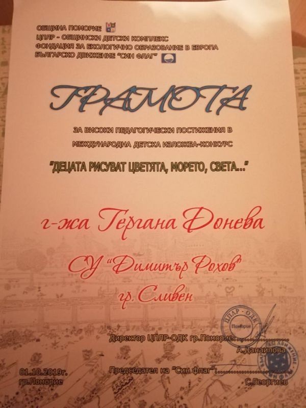 Учениците от 7 а клас - Стефан Димитров Георгиев и Райно Станимиров Петков, взеха участие и представиха достойно Спортно училище "Димитър Рохов" Сливен в Международна детска изложба конкурс "Децата рисуват цветята, морето, света..." Нейни организатори бяха Община Поморие, Общински Детски Комплекс, Фондация за екологично образование в Европа, Българско движение "Син флаг".