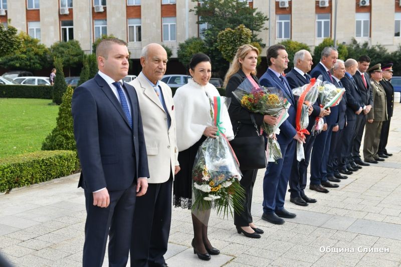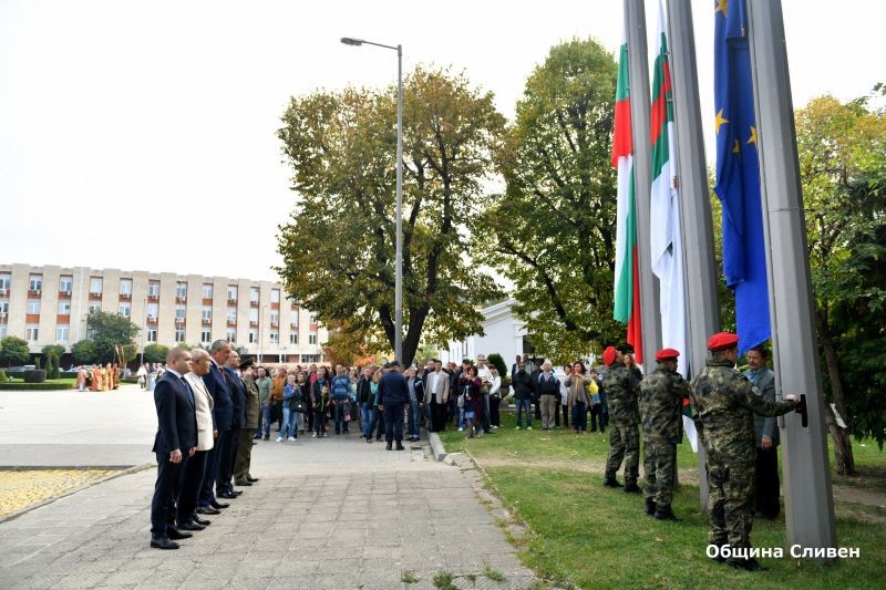Тържествената церемония за отбелязване на празника на пл. ,,Хаджи Димитър” започна с издигане на националното знаме, знамето на Сливен и Европейската общност.