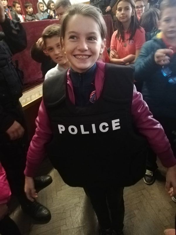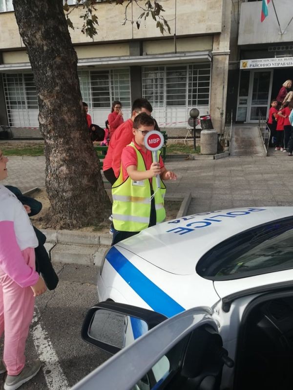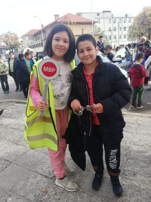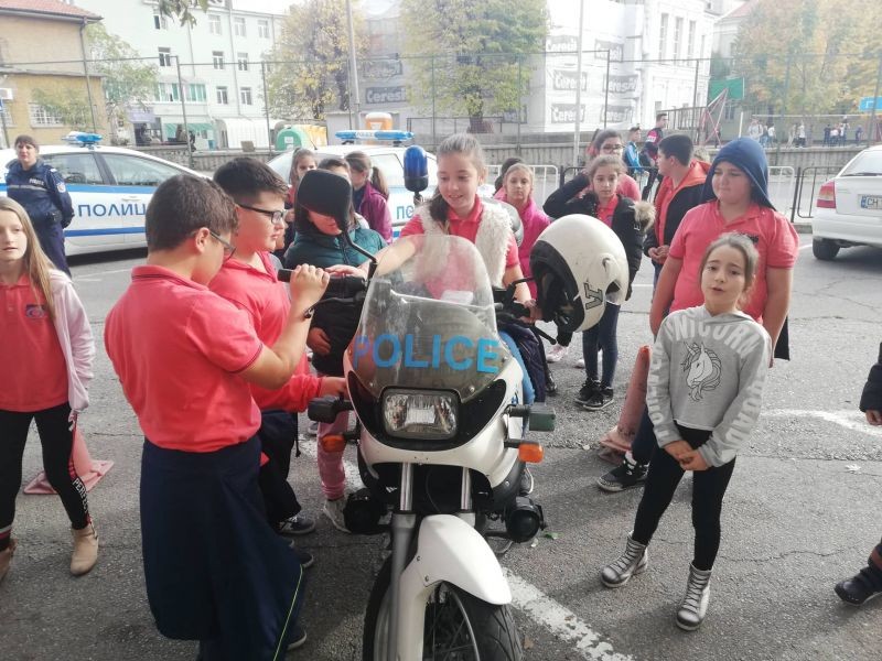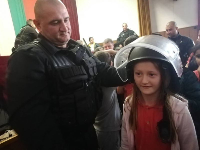 Четвъртокласниците видяха стаята, в която се приемат спешните обаждания, научиха повече за работата на полицаите и имаха възможност да видят и пробват полицейски бронежилетки, каски и шлемове.