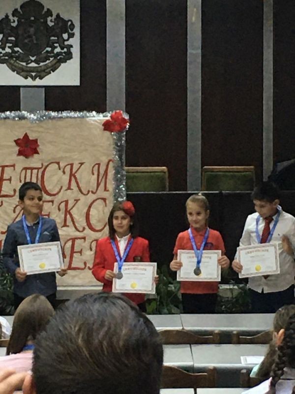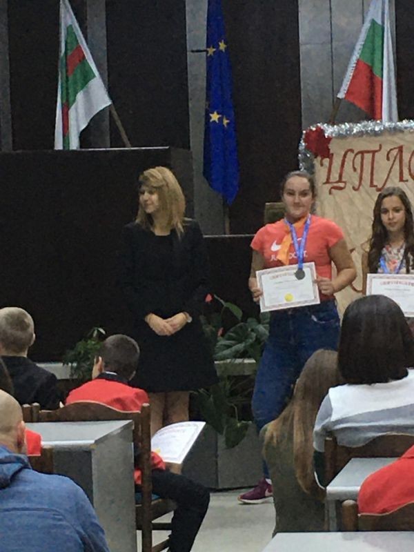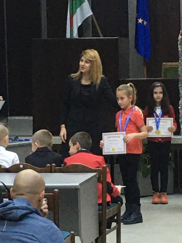 Заместник-кметът на община Сливен г-жа Пепа Чиликова връчи сребърни медали и сертификати на Белослава Гайдарова от 2. "б" клас и на Мартин Савов от 2. "а" клас.