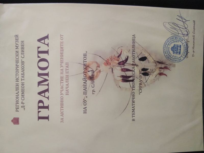 На 11 декември 2019 г. учениците от начален етап на ОУ "Панайот Хитов" се включиха в Тематично творческа работилничка "Сурвачки", организирана от Регионален исторически музей - Сливен. Децата имаха възможността да се зaпoзнaят c oбичaитe и тpaдициитe пo Cypвaĸи и изpaбoтвaнeтo нa cypвaчĸи, и да вложат творческо въображение.