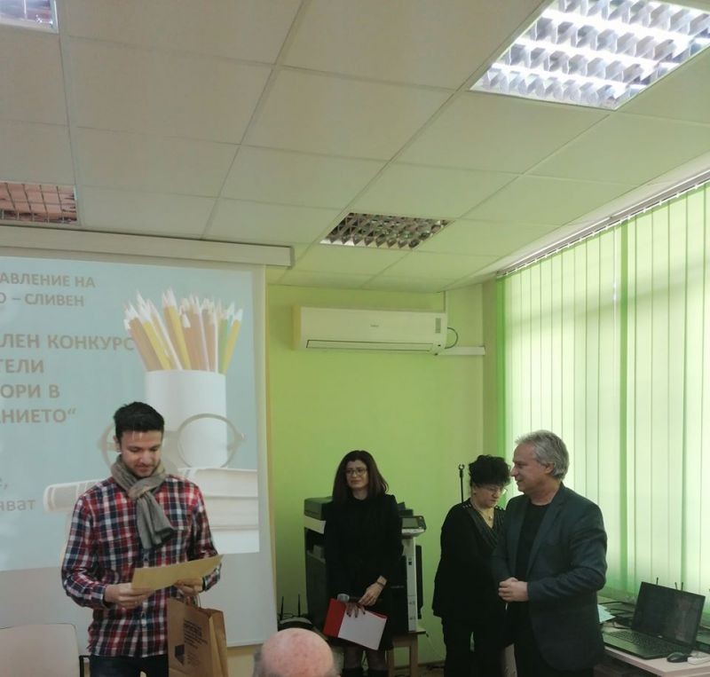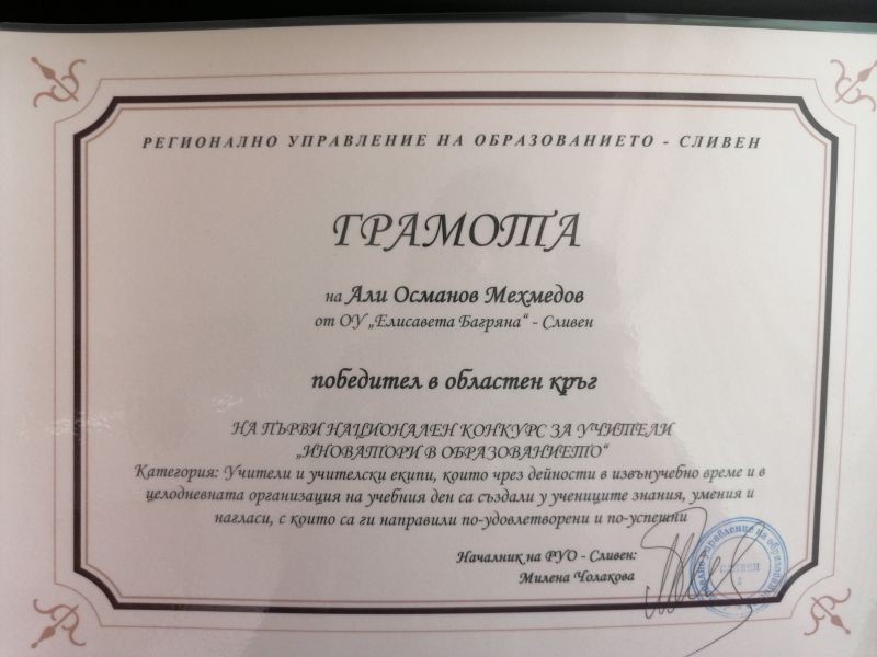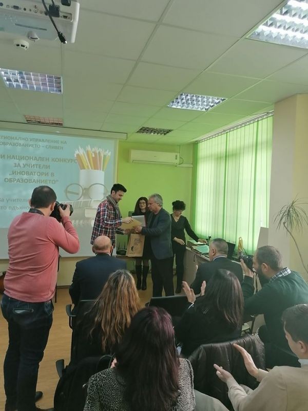 Честито на г-н Али Мехмедов, който е победител в областния кръг на първия Национален конкурс за учители "Иноватори в образованието"! Неговата награда беше връчена на официална церемония в Регионалното управление на образованието в Сливен.