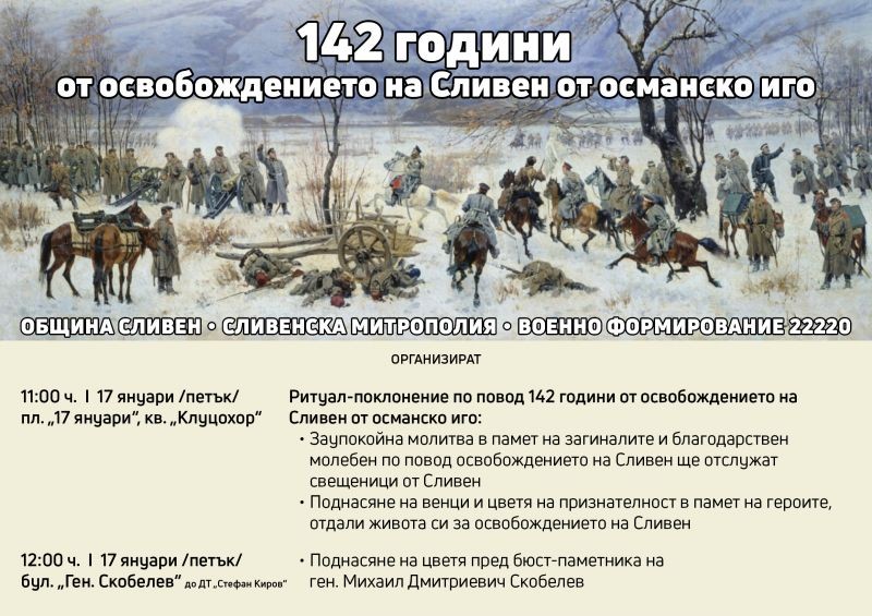 На 17 януари ще бъдат отбелязани 142 години от освобождението на Сливен от османско иго. От 11.00 часа на площад „17 януари“ в квартал „Клуцохор“ ще се проведе ритуал-поклонение, който включва заупокойна молитва в памет на загиналите и благодарствен молебен по повод освобождението на Сливен. Ще бъдат поднесени венци и цветя на признателност в памет на героите, отдали живота си за освобождението на Сливен. Проявата се организира от Община Сливен, в партньорство със Сливенска митрополия и Военно формирование 22220. Членовете на Регионален клуб „Хаджи Димитър“ към Национално дружество „Традиция“ ще участват с почетен караул и залп. В проявата ще се включи и хорът при Руско дружество „Отчий дом“ и Българо-руски пенсионерски клуб „Славяне“.