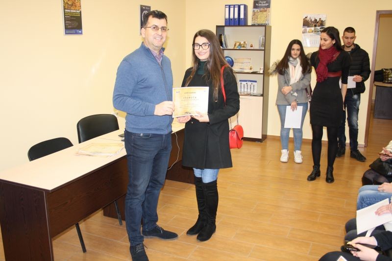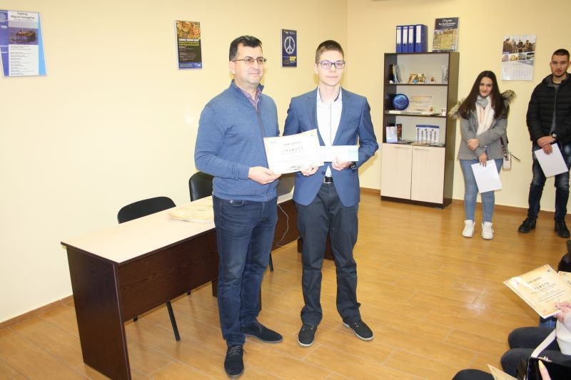 Стоян Иванов, ученик в 10 клас на ПГПЗЕ „Захарий Стоянов“ - Сливен, спечели първото място. Той ще посети Европейския парламент в Брюксел през април.