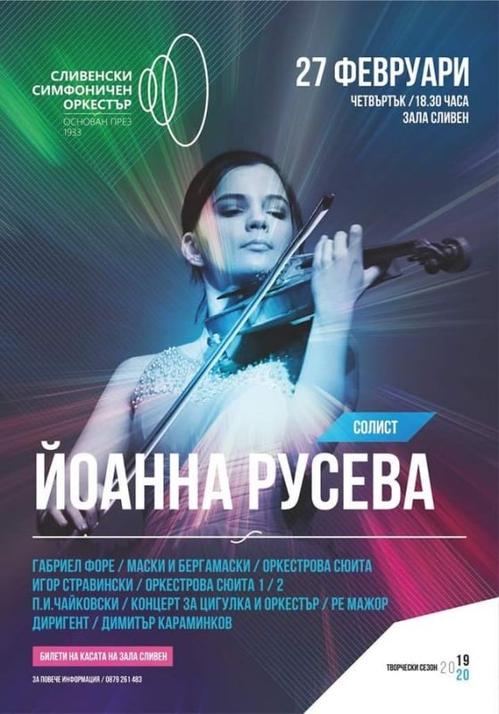 Сливенският симфоничен оркестър отново ще зарадва почитателите на класическата музика с концерт на 27 февруари. Под диригентството на маестро Димитър Караминков ще бъдат изпълнени произведения от Форе, Стравински и Чайковски. Солист на вечерта ще бъде Йоанна Русева. Началото на концерта е 18.30 часа. Билети могат да бъдат закупени на касата на зала Сливен. За повече информация и резервации тел. 0879261483