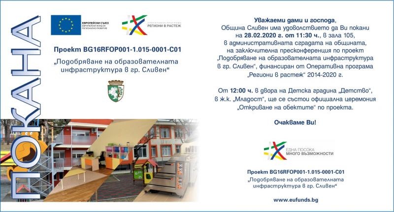 Община Сливен ще проведе на 28 февруари – петък, две официални събития във връзка с приключването на проект „Подобряване на образователната инфраструктура в гр. Сливен”. От 11:30 ч., в зала № 105, в административната сграда на Общината ще се проведе заключителна пресконференция, на която ще бъдат представени постигнатите резултати от изпълнението на проекта – обновяване и модернизиране на четири обекта на образователната инфраструктура – детските градини „Детство”, „Зорница”, „Мак” и „Вержин и Хаик Папазян”.