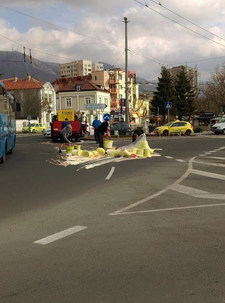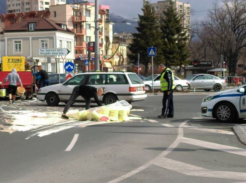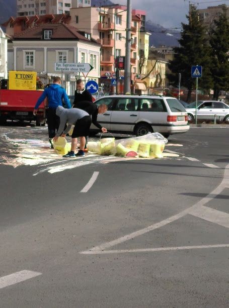 Очевидци разказаха за Радио Сливен Нет, че се разсипало голямо количество от стоката. Докато повечето минувачи и шофьори от другите коли по това време на кръcтовището се забавлявали, водачът на камиона с боята изпаднал в паника. Единствено учиници от Спортното училище му се притекли на помощ. Джан Нуков, Цветомир Николов, Тони Павлов и Кристиян Кънев, възпитаници на клуба по борба, помогнали на човека в затруднено положение. Бързо и организирано, типично за добри спортисти, децата успели да върнат здравите баки в камиона и движението било възстановено, с професионалната намеса и на органите на реда.