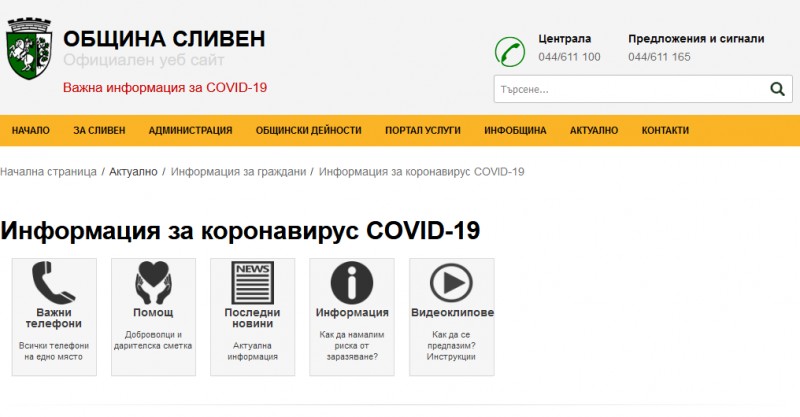 Раздел с информация за новия коронавирус COVID-19 е добавен в сайта на Община Сливен. На адрес https://mun.sliven.bg/covid-19 са публикувани актуални телефонни номера на едно място, инструкции за предпазване от заразяване и информация за вируса.