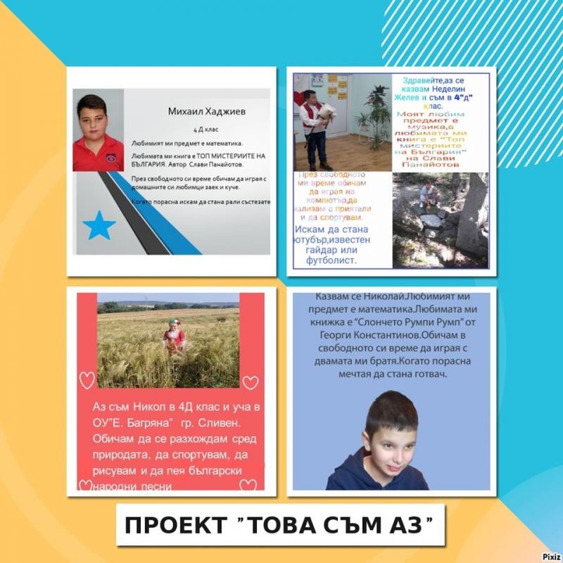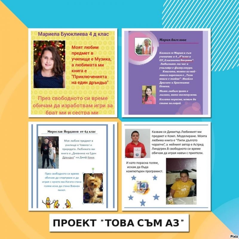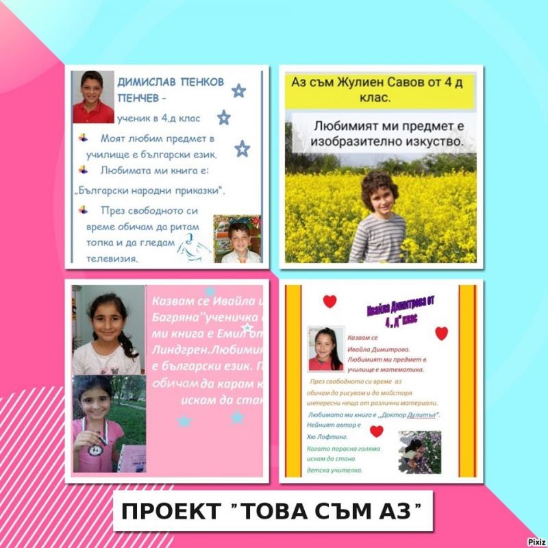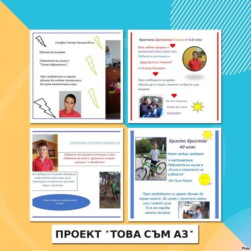 Групата по интереси „Компютърно моделиране и презентации“ с ръководител г-жа Йорданка Стефанова продължава своята работа и по време на дистанционната форма на обучение. Участниците в групата с голямо желание се включиха в работата по проекта „Това съм аз“. Всеки един от учениците трябваше да прояви фантазия и умения за работа в програмите MS Word и Paint, за да представи себе си – любимия предмет в училище, любимата книга и да сподели мечтата си, какъв иска да стане, когато порасне. Те решиха да споделят с всички продукта от своята работа. Спомените са красиво нещо, което ни свързва с миналото и ни връща в света, който вече не е при нас. Този проект ще остане незабравим спомен за учениците от групата, чрез който те ще се връщат отново в 4 клас.