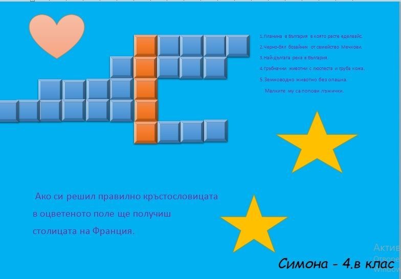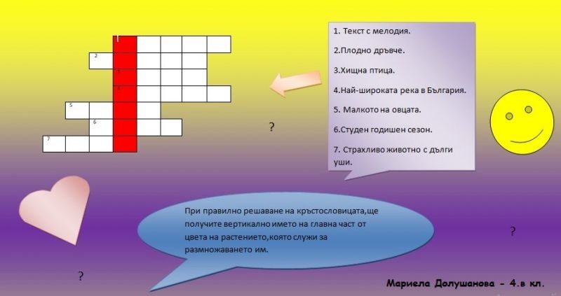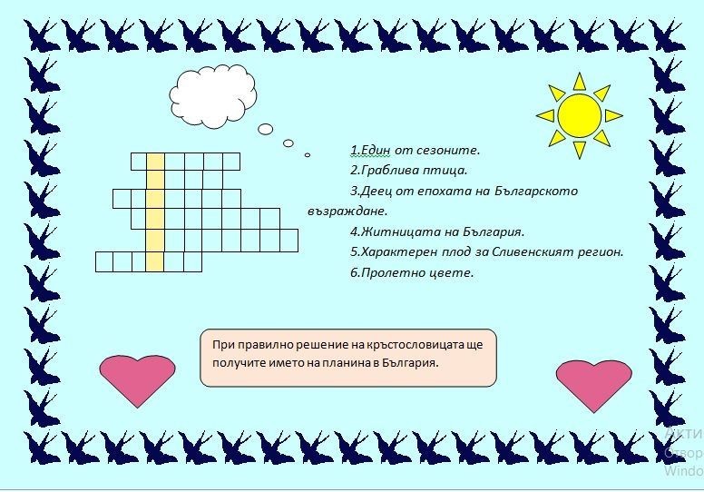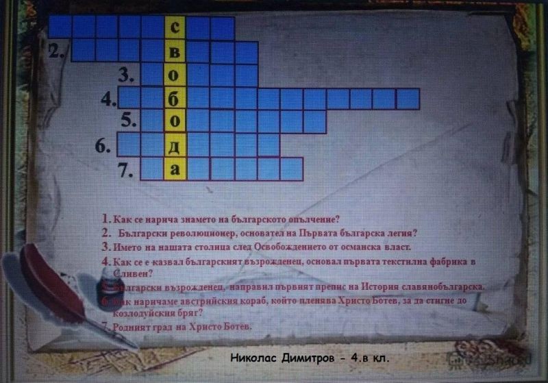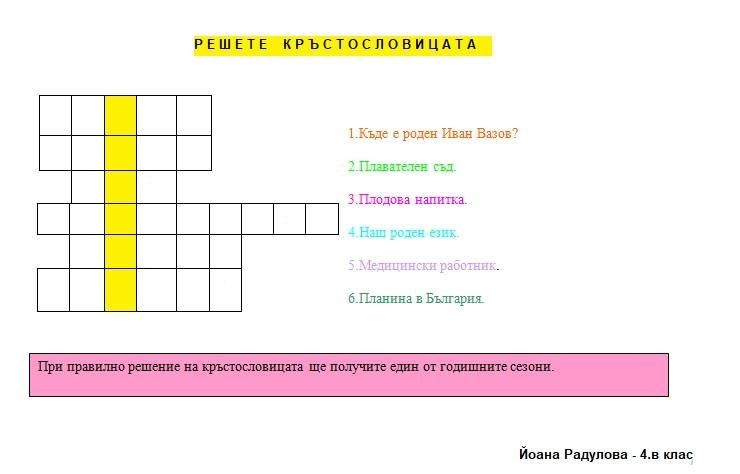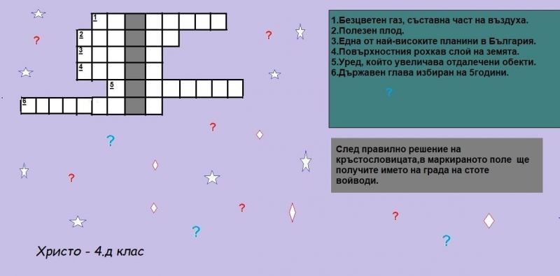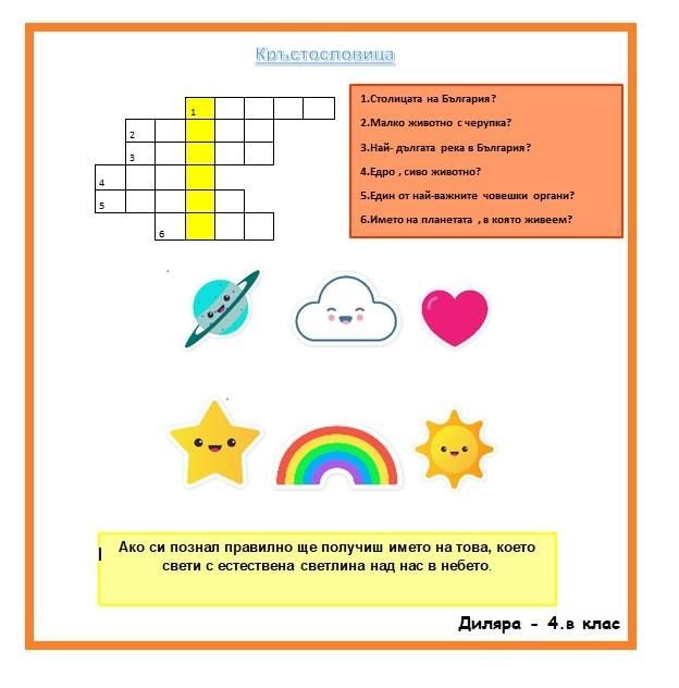 Участниците в групата „Уча и играя на компютъра“ по проект „Образование за утрешния ден“ с ръководител г-жа Йорданка Стефанова продължават да трупат знания, въпреки наложената дистанционна форма на работа. Една от темите, по която те работиха е: „Моята кръстословица“. Всяко едно от децата изработи в програмата MS Word и Paint ребус, по начин, който на него му харесва – едни чрез въпроси, други – чрез картинки. Кръстословиците са красиви, интересни и забавни. Любителите на ребуси могат да проверят своите знания, бързина и досетливост. Приятно решаване!