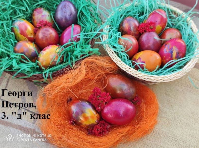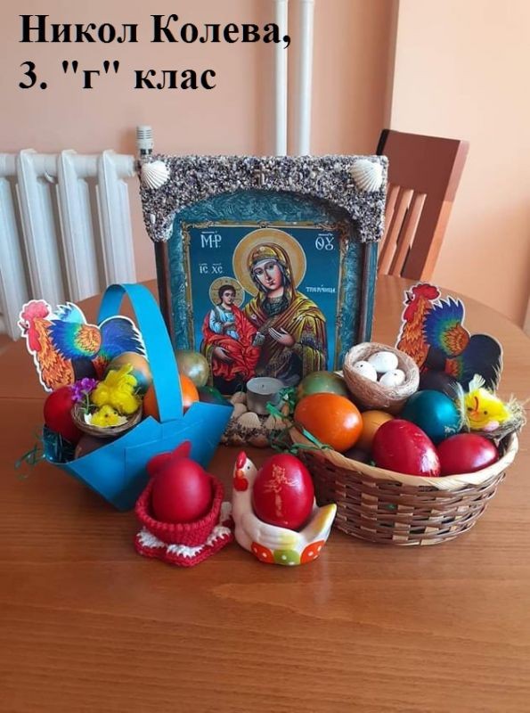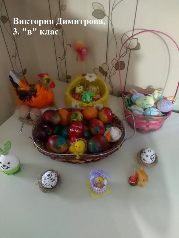 Учители и ученици от 3. клас от ОУ "Елисавета Багряна" подредиха изложба под надслов "Пъстър Великден". Те се обединиха в навечерието на светлия християнски празник и си подариха много настроение.
