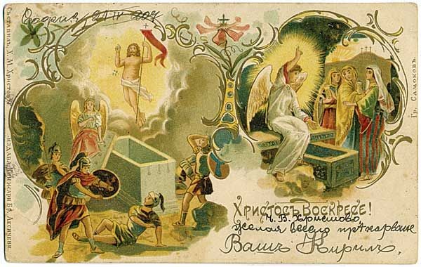 Първата българска великденска картичка се появява през 1899 г. и е по-скоро честитка с великденски сюжет. Тя изобразява Христовото Въскресение в серия от картини. Текстът на лицето на картичка¬та е „Христос Воскресе!”. Неин създател е Х. М. Христов, тиражирана е от издателството на Братя Лесичкови, а е отпечатана в Самоков.