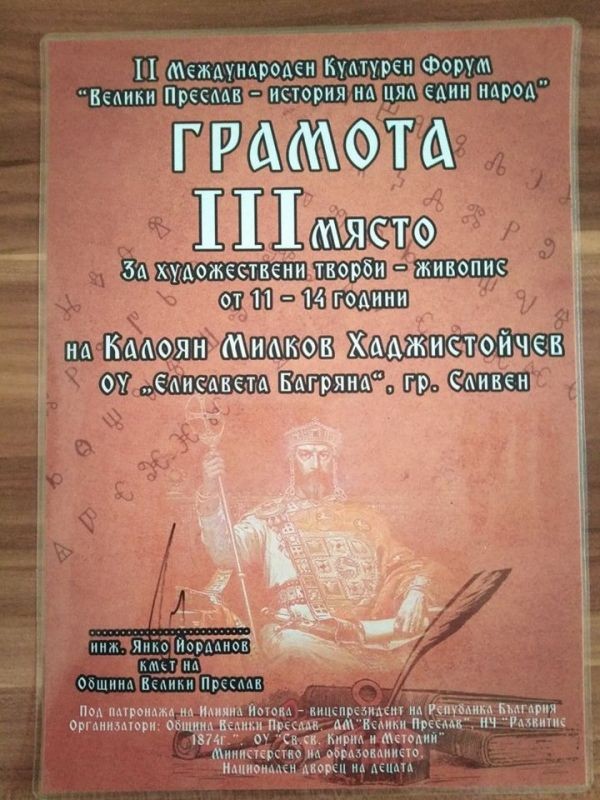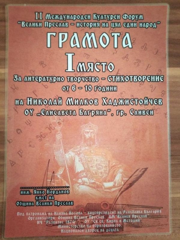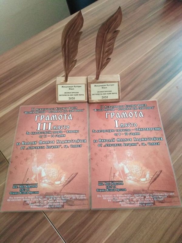 В Международния културен форум „Велики Преслав – история на цял един народ” Николай спечели първо място със стихотворение в категорията от 6-10 години, а брат му Калоян се класира на трето място за художествена творба – живопис в категорията от 11 до 14 години.